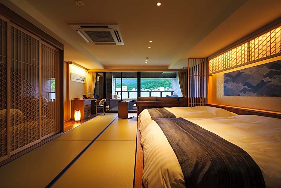 This suite features a hot tub and a private open-air bath. This spacious suite features 1 bedroom, a seating area and 1 bathroom with a bath and a shower. The air-conditioned suite features a flat-screen TV, tatami, a tea and coffee maker, executive lounge access as well as river views. The unit has 5 futons.